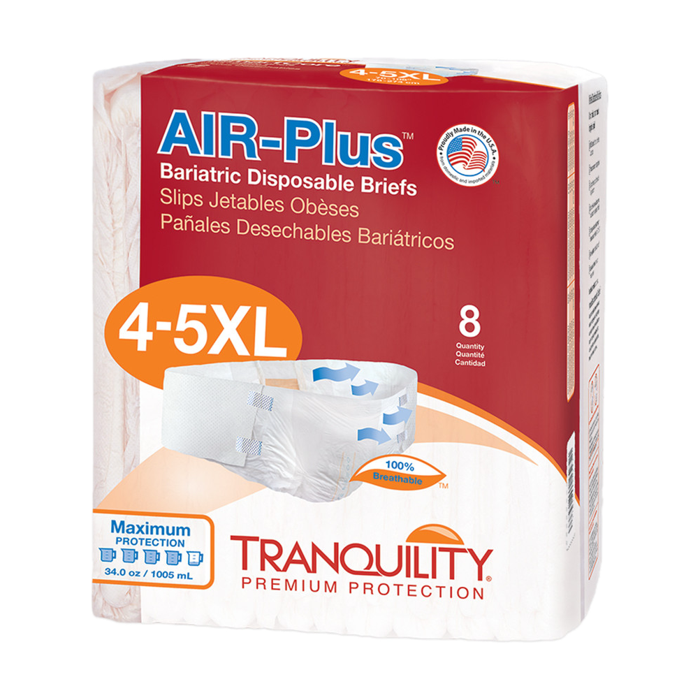Tranquility Air-Plus Bariatric Briefs are premium disposable briefs designed for plus-size protection, comfort, and skin health. With 100% breathable materials, these briefs allow heat and moisture vapor to escape, helping maintain skin integrity while delivering reliable overnight absorbency.